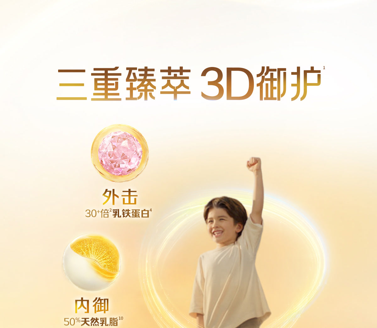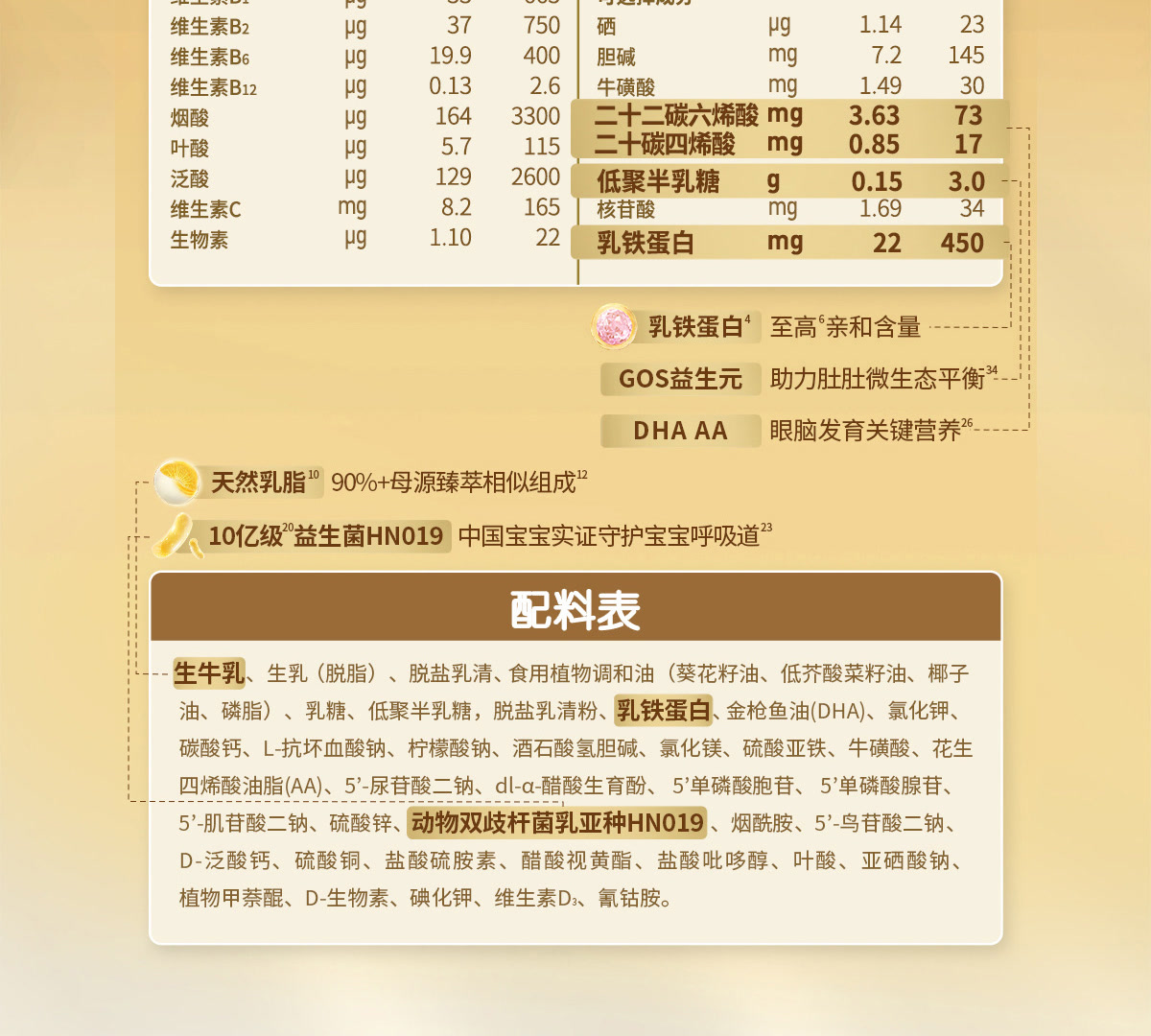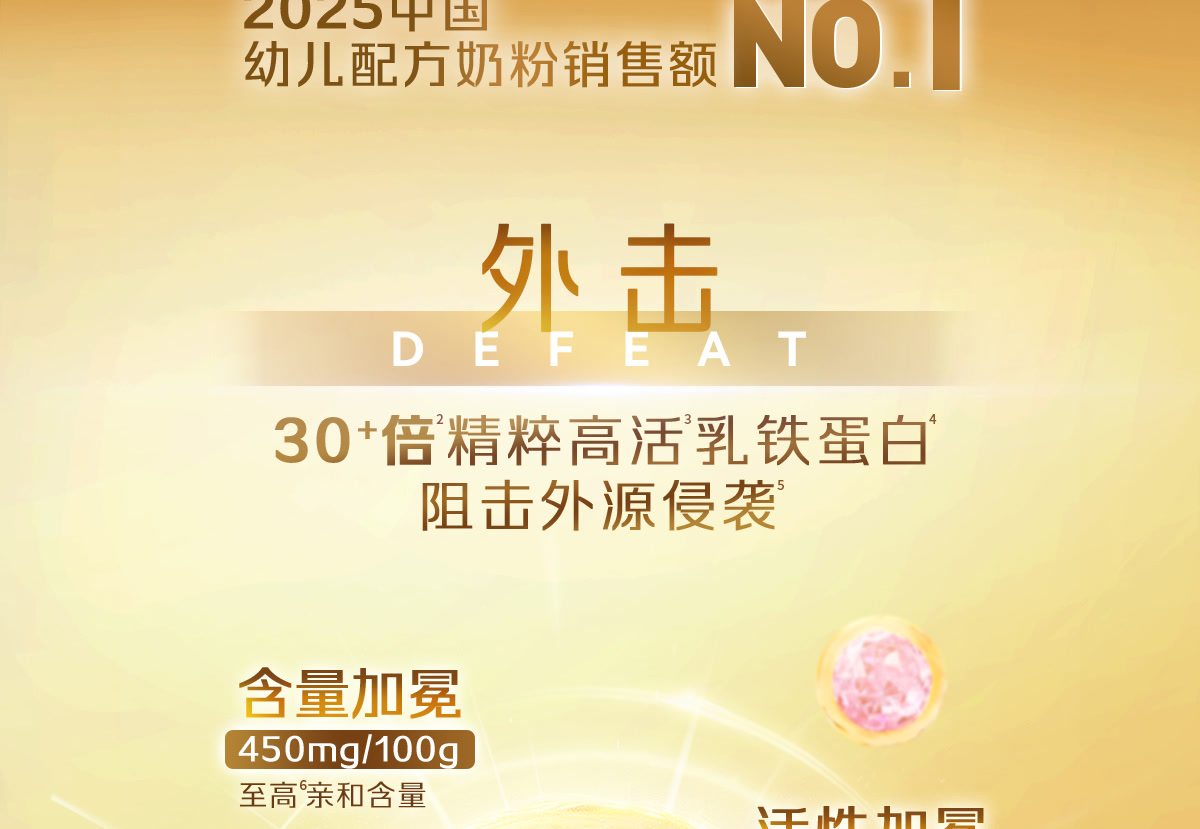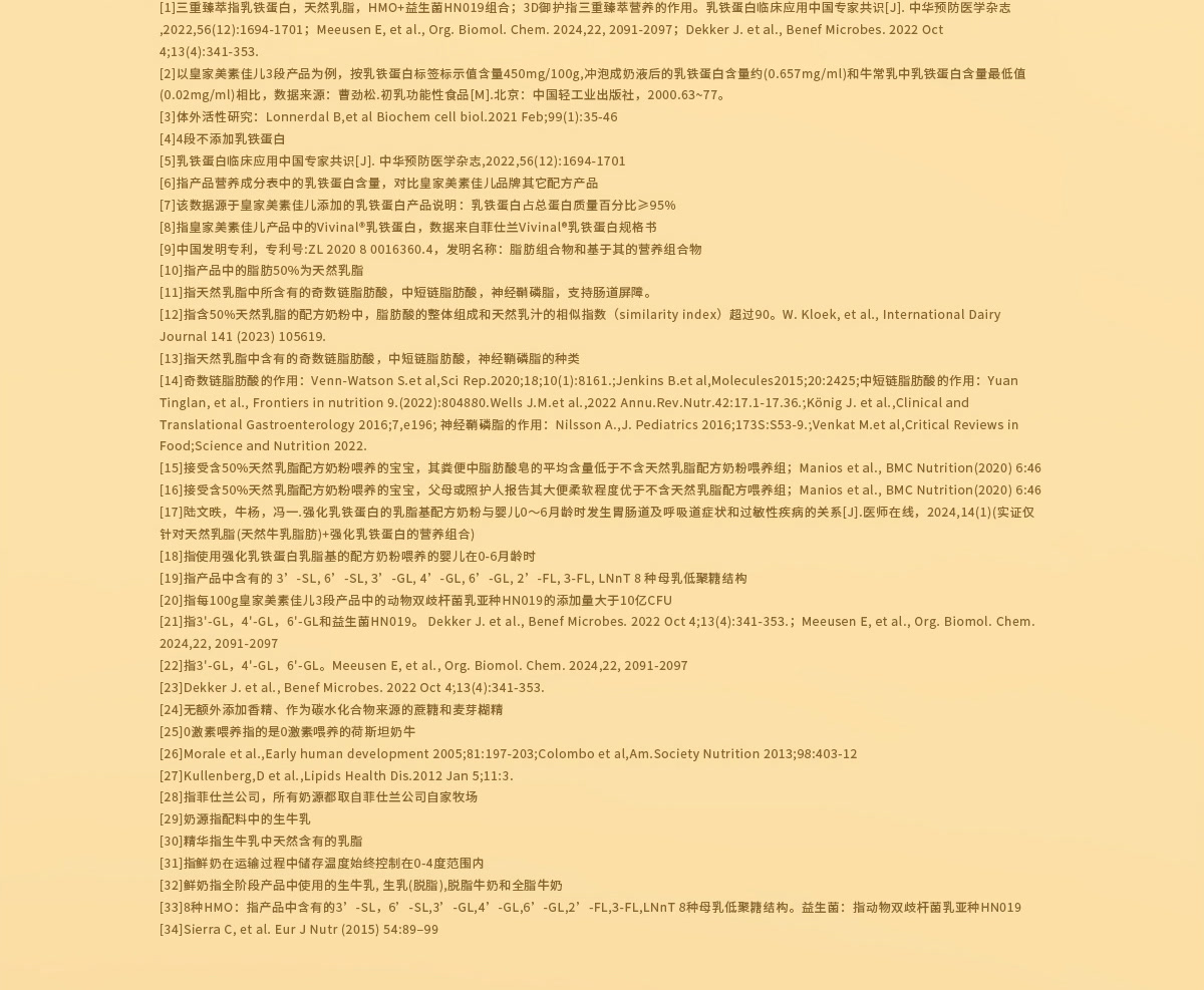 [1] 三重臻萃指乳铁蛋白,天然乳脂,HMO+益生菌HN019组合;3D御护指三重臻萃营养的作用。乳铁蛋白临床应用中国专家共识[J]. 中华预防医学杂志,2022,56(12):1694-1701;Meeusen E, et al., Org. Biomol. Chem. 2024,22, 2091-2097;Dekker J. et al., Benef Microbes. 2022 Oct 4;13(4):341-353