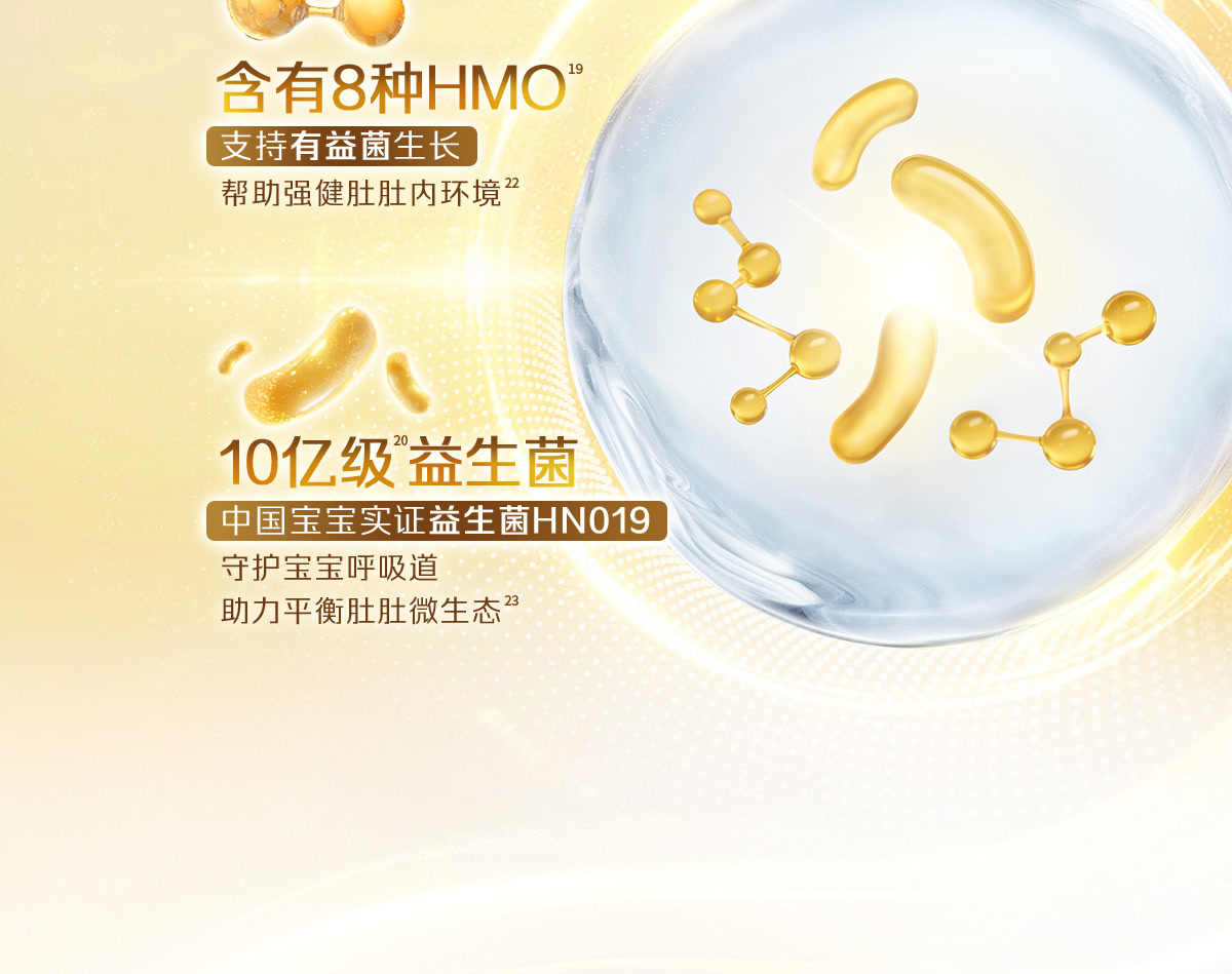 [5] 8种HMO:指产品中含有的3’-SL,6’-SL,3’-GL,4’-GL,6’-GL,2’-FL,3-FL,LNnT 8种母乳低聚糖结构。益生菌:指动物双歧杆菌乳亚种HN019。
